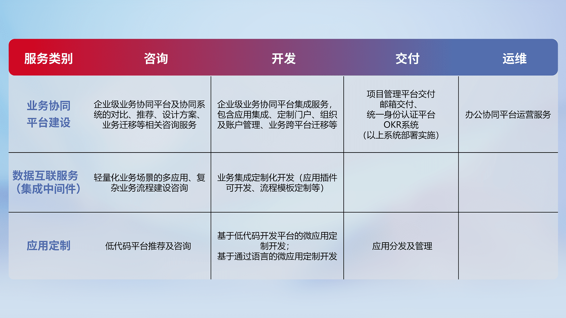 针对钉钉、、、企微、、IDaas等平台级产品提供产品的规划、、、方案、、交付、、定制化开发等服务,,,,实现如统一协同办公、、智能客户服务、、混合会议管理、、、智能数据查询、、、、等业务场景,,实现数字化转型。。。